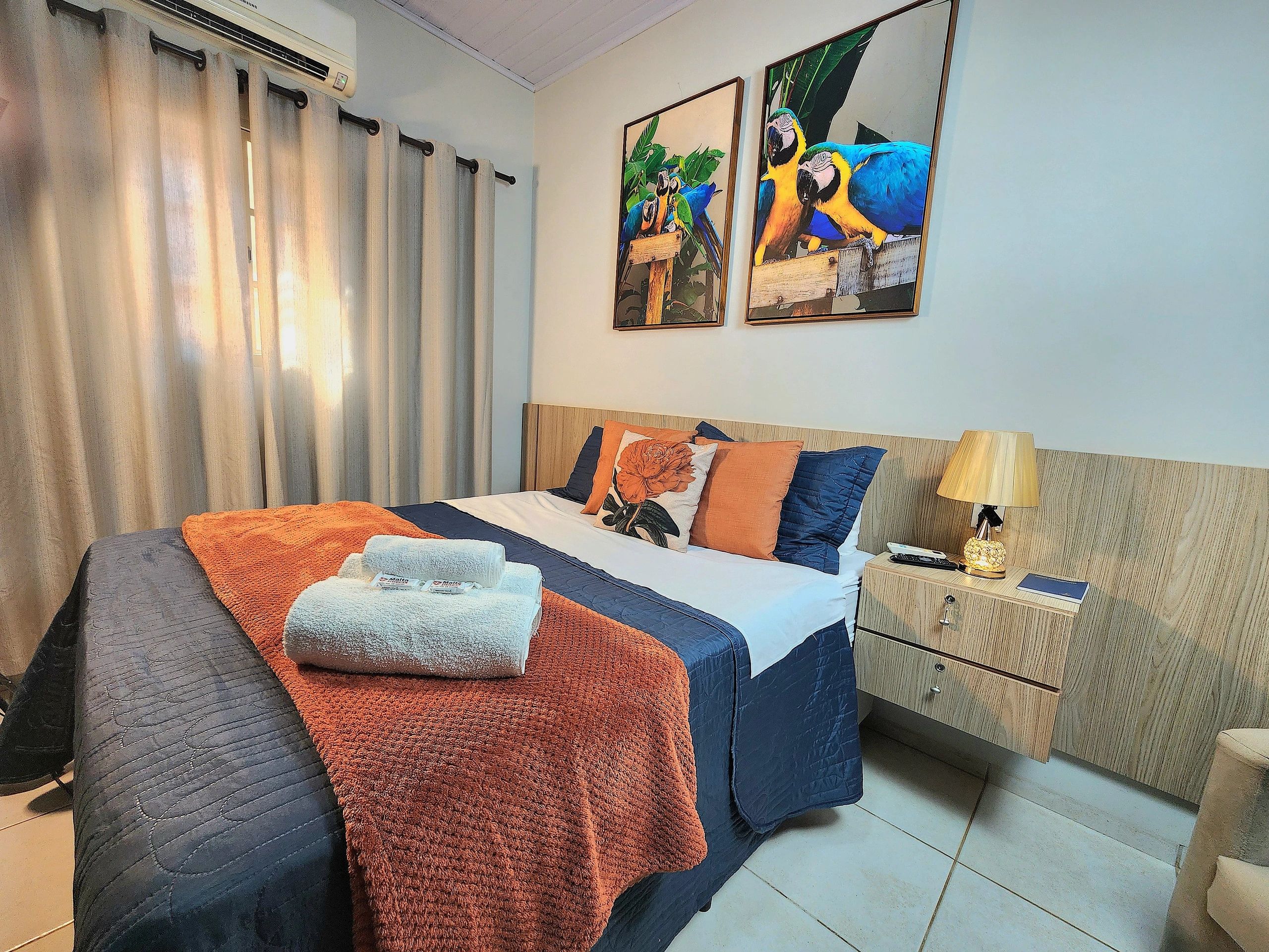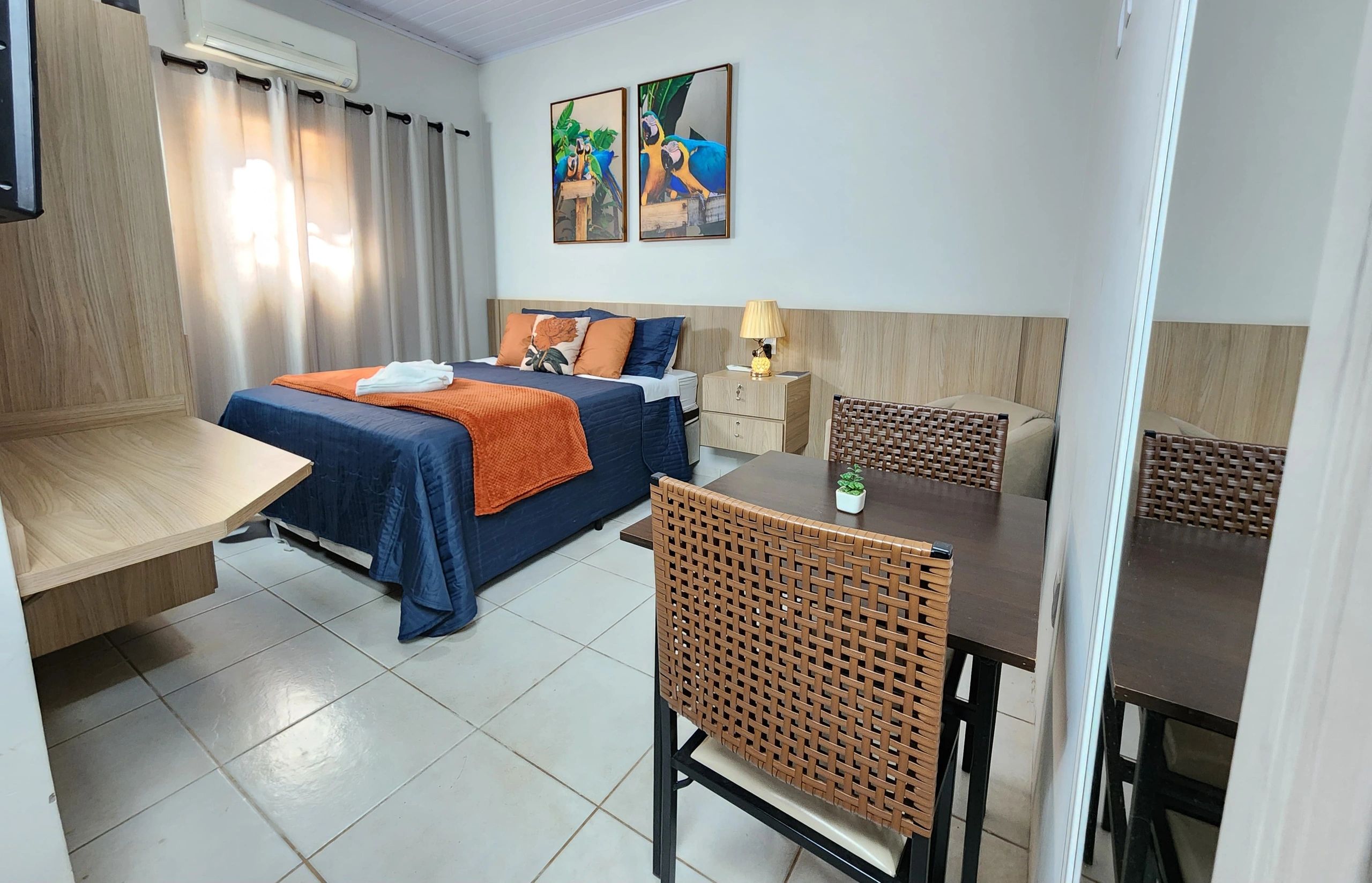 Cama de casal, roupa de cama com cobre leito, manta, almofadas, poltrona , cortinas, mesa de jantar, travesseiros de penas de ganso sintética e também 100% penas de ganso, decoração superior, mais espaço, TV 47/49”, frigobar da cor da tv, cortesia: IPTV – streaming e canais fechados + smart tv