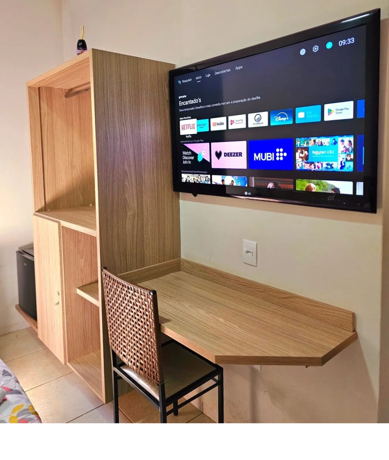 Cama de casal, roupa de cama básica, possuem TV 42” e frigobar Cortesia: IPTV – streaming e canais fechados + smart tv